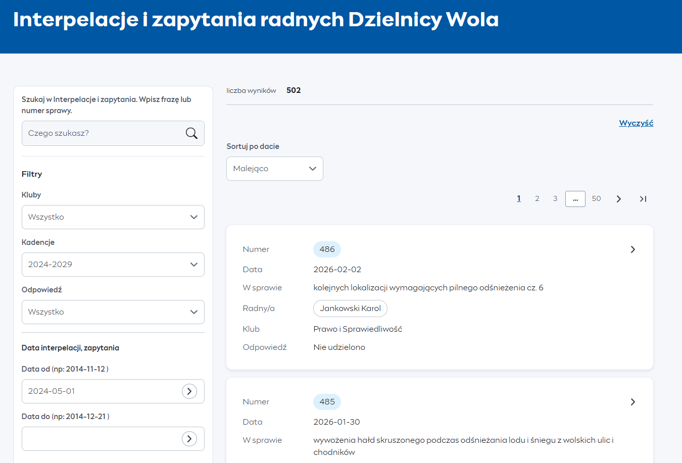 Interpelacje i zapytania są jednym z podstawowych narzędzi pracy radnych. Dzięki nim mogą zgłaszać problemy mieszkańców oraz wnioskować o wyjaśnienia w sprawach istotnych dla funkcjonowania dzielnicy i życia jej mieszkańców. Choć składanie interpelacji nie jest obowiązkowe, w przeciwieństwie do uczestnictwa w sesjach rady czy pracach komisji, liczba zgłaszanych interpelacji przez radnych jest istotnym, choć nie pełnym wskaźnikiem ich aktywności i zaangażowania w sprawy mieszkańców. Odpowiedzi na interpelacje oraz ich treść są publikowane w Biuletynie Informacji Publicznej, co pozwala każdemu śledzić je na bieżąco. Zakres zgłaszanych spraw jest bardzo zróżnicowany – od drobnych, codziennych problemów, takich jak uszkodzone latarnie czy nieodśnieżone chodniki, po złożone kwestie organizacyjne i strategiczne związane z funkcjonowaniem dzielnicy.